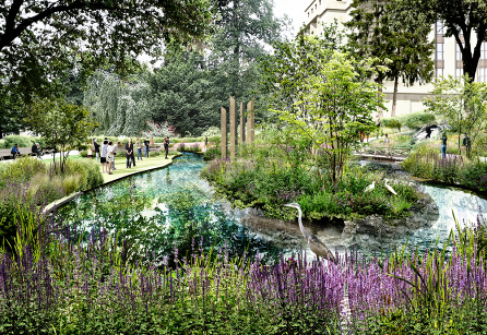 Le jardin mémoriel. Vue d’ensemble vers la Tour Eiffel. (Projet Desvignes) |